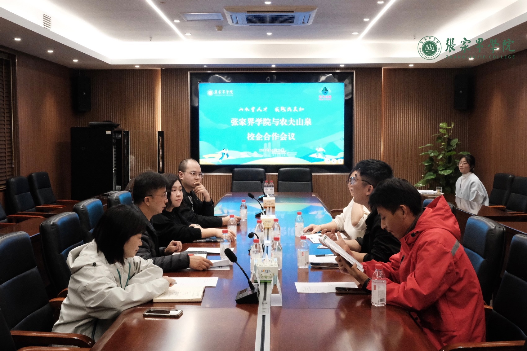10月29日下午,张家界学院与农夫山泉股份有限公司校企合作签约暨授牌仪式在学校望岳楼达观厅举行。农夫山泉湘北大区人力资源部经理杨宁,农夫山泉张家界办事处客户经理柴毅、人才招聘专业经理郑金红,张家界学院招生就业处处长李岑,大学生就业指导中心主任陈思吟等出席会议。会议由李岑主持。