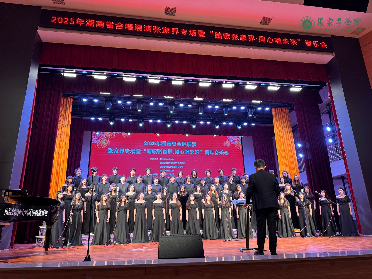 12月21日,由张家界市文化馆、工人文化宫、音乐家协会联合主办的“2025年湖南省合唱展演张家界专场暨‘踏歌张家界・同心唱未来’新年音乐会”精彩上演。张家界学院合唱团受邀参演,音乐系学生全程积极参与,音乐系主任陈永勇受邀担任评委,师生携手在这场本土文化盛事中展现专业风采,为活动顺利举办贡献高校力量。
