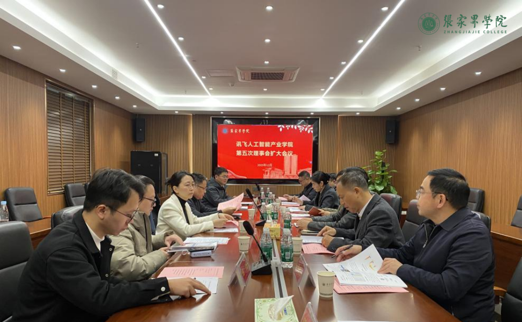 12月26日,张家界学院讯飞人工智能产业学院第五次理事会扩大会议在望岳楼15楼达观厅召开。张家界学院副校长、产业学院理事长何小飞,科大讯飞教育事业群副总裁、产业学院副理事长马季,张家界学院教务处处长庹清、科大讯飞产教融合业务总经理张承云、信息与智能工程学院院长陈继锋、理工学院党委书记边文钰,信息与智能工程学院党总支书记唐志文等校企双方相关负责人参加会议。会议由何小飞主持。