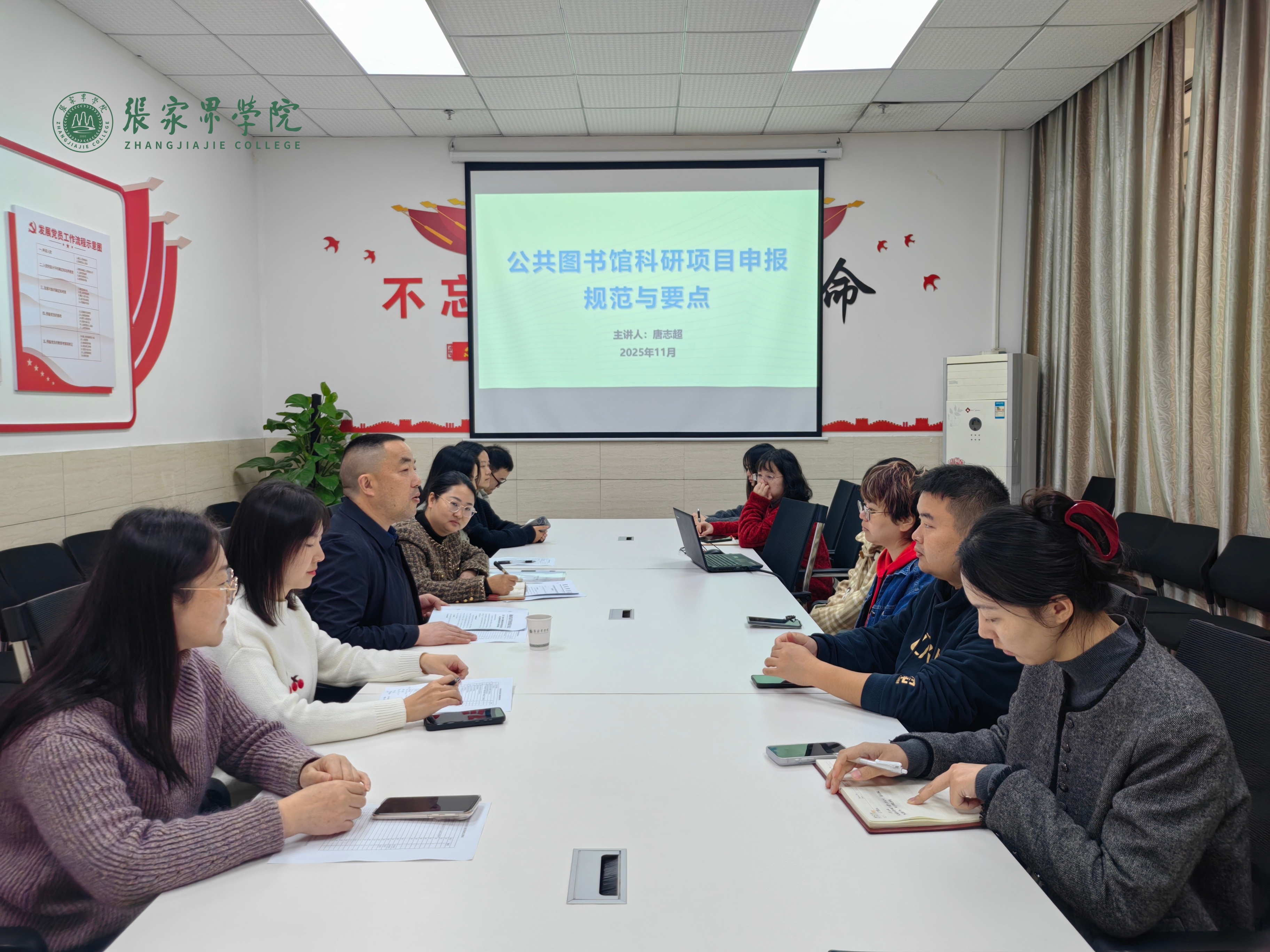 11月21日,为深化张家界学院图书馆与张家界市图书馆共建共享机制,进一步规范公共图书馆科研项目申报流程、提升馆员科研能力与学术素养,公共图书馆科研课题申报专题培训会在我校图书馆学海厅开展。活动特邀张家界市图书馆馆长唐志超担任主讲嘉宾,张家界学院图书馆副馆长刘欢主持会议,全体馆员参加培训。