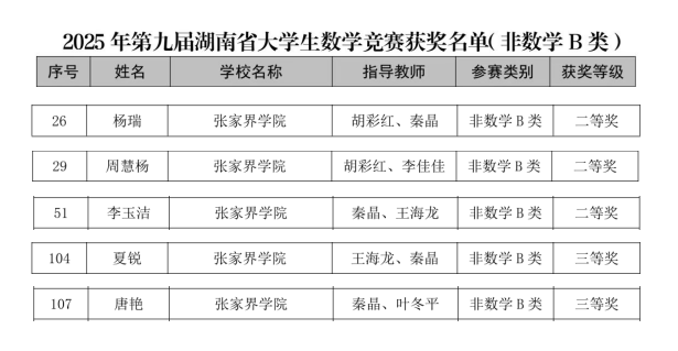 近日,湖南省教育厅开展2025年第九届湖南省大学生数学竞赛。我校学生在此次竞赛中凭借良好的竞技状态沉着应战,最终在非数B类赛事中斩获佳绩,为学校赢得了荣誉。