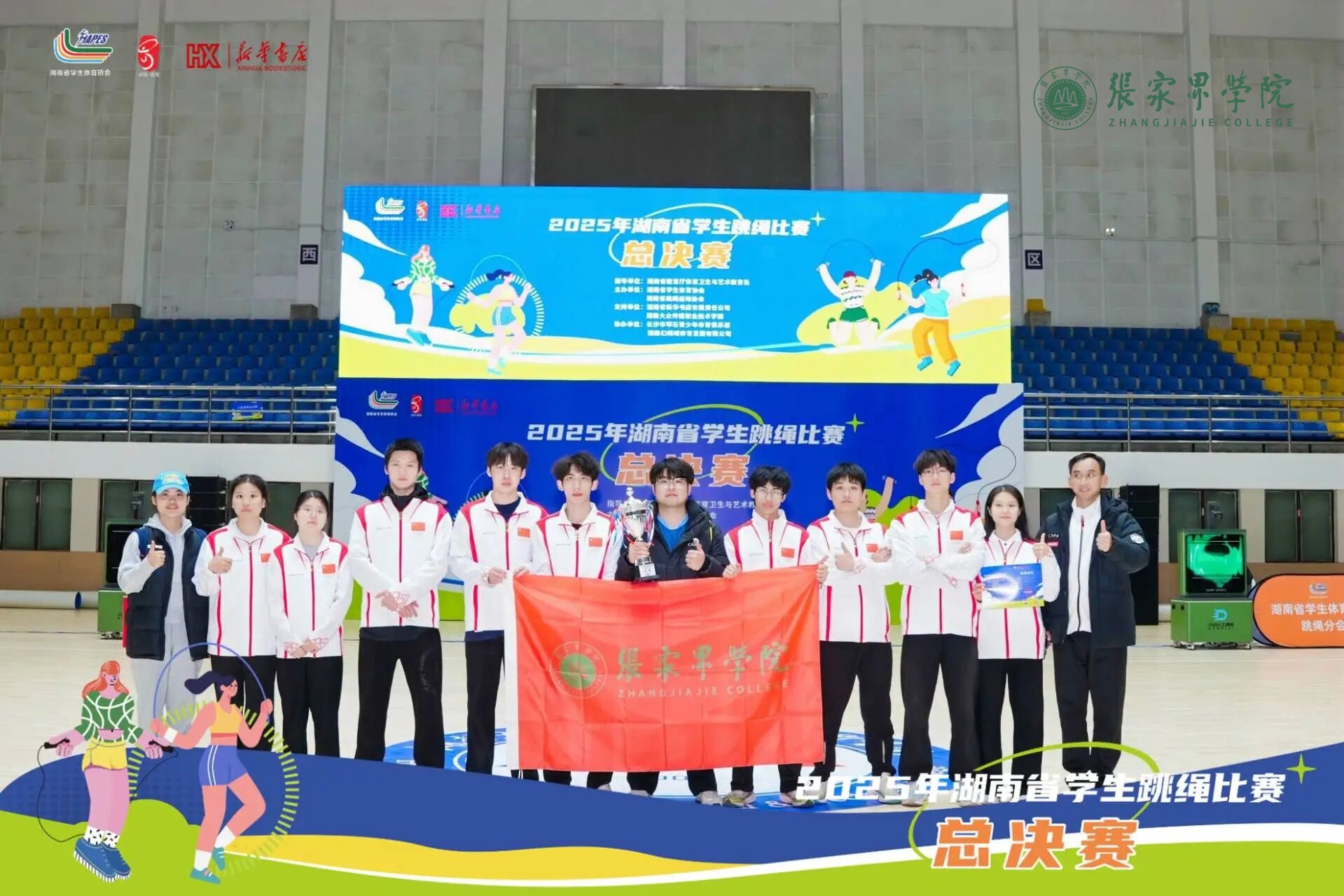 11月21至23日,2025年湖南省学生跳绳比赛总决赛在湖南大众传媒职业技术学院体育馆举行。张家界学院花样跳绳队选派10名队员参赛,凭借扎实的功底与出色的临场发挥,最终斩获集体项目1冠1亚1季,个人项目1季、3个第五、1个第六、2个第七、2个第八的亮眼成绩。
