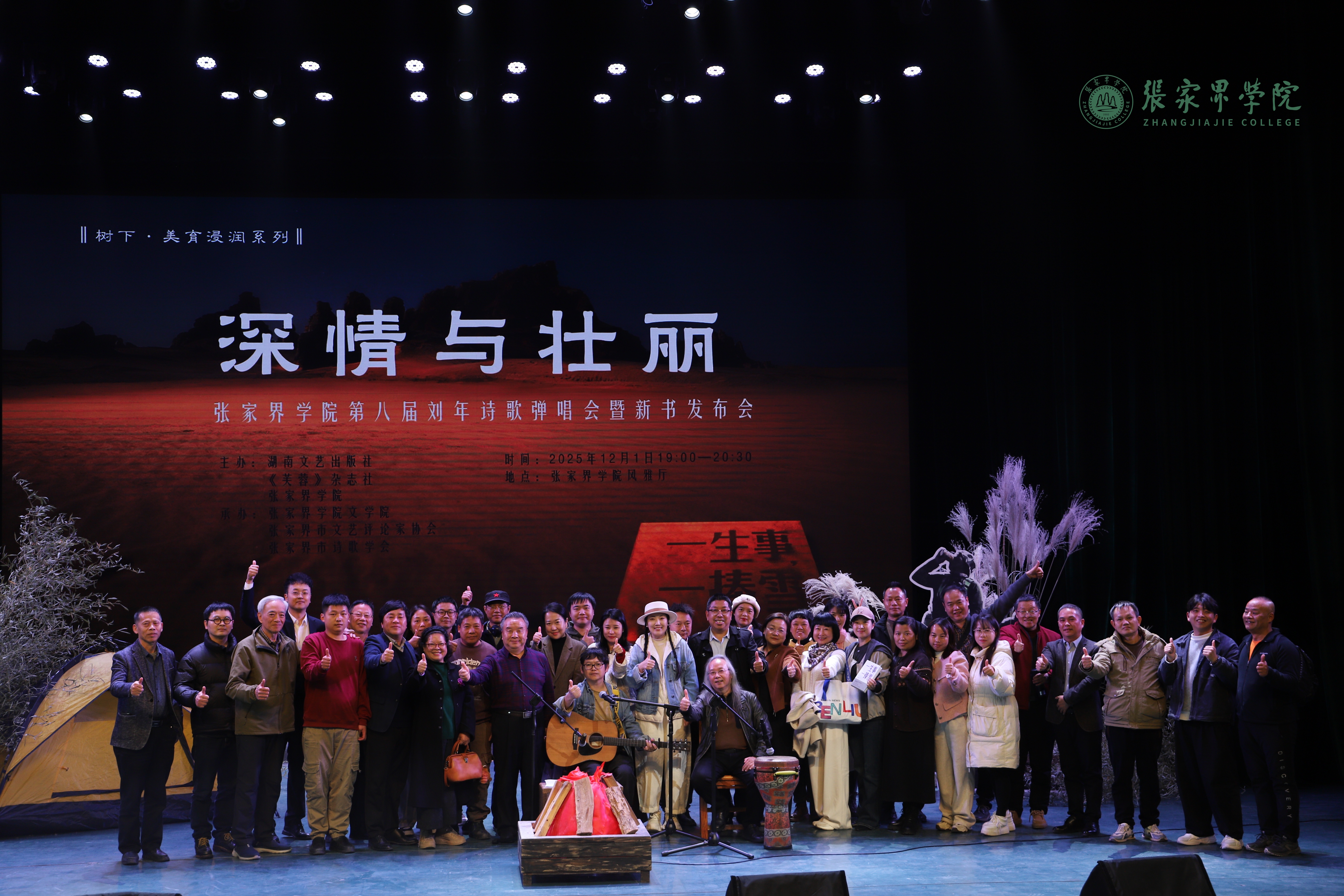 12月1日晚,以“深情与壮丽”为主题的张家界学院第八届刘年诗歌弹唱会暨新诗集发布会在学校风雅厅举行。活动通过弹唱、朗诵、击鼓等多元形式,将诗歌文化与学校美育工作相结合,为600余名师生呈现了一场富有乐感和美感的“育人课堂”。
