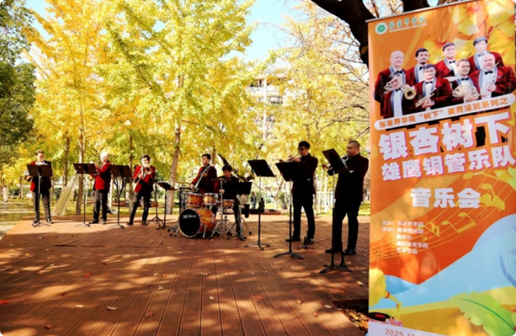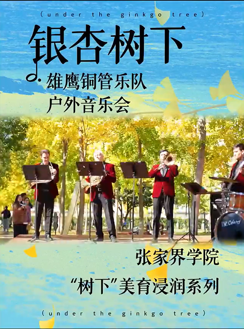近日,秋意正浓、杏叶流金的张家界学院“树下”美育浸润系列活动“银杏树下”之雄鹰铜管乐队户外音乐会浪漫开演。 阳光透过金黄银杏叶洒下斑驳光影,乐队成员奏响经典曲目。激昂与舒缓交织的旋律在学院回荡,时而轻快灵动,时而恢弘悠扬,与随风飘落的银杏叶相映成趣。师生们或坐或立,沉浸在这场自然与艺术交融的听觉盛宴中,不时响起阵阵掌声。 此次活动以户外场景为依托,将铜管乐艺术融入校园秋景,创新美育表达形式,让师生在沉浸式体验中感受经典音乐之美,让美育在日常中浸润人心。