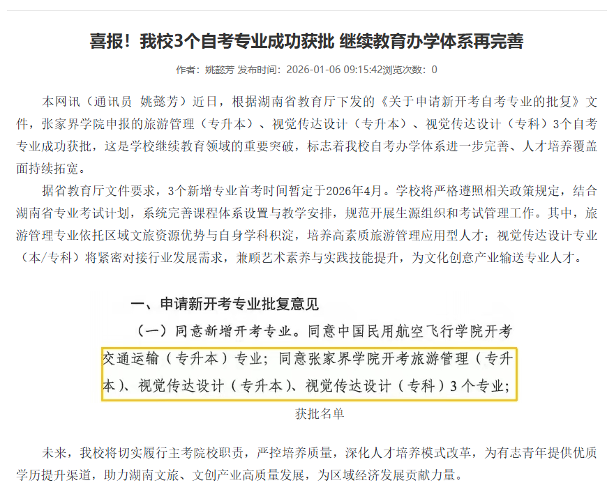 本网讯(通讯员 姚懿芳)近日,根据湖南省教育厅下发的《关于申请新开考自考专业的批复》文件,张家界学院申报的旅游管理(专升本)、视觉传达设计(专升本)、视觉传达设计(专科)3个自考专业成功获批,这是学校继续教育领域的重要突破,标志着我校自考办学体系进一步完善、人才培养覆盖面持续拓宽。