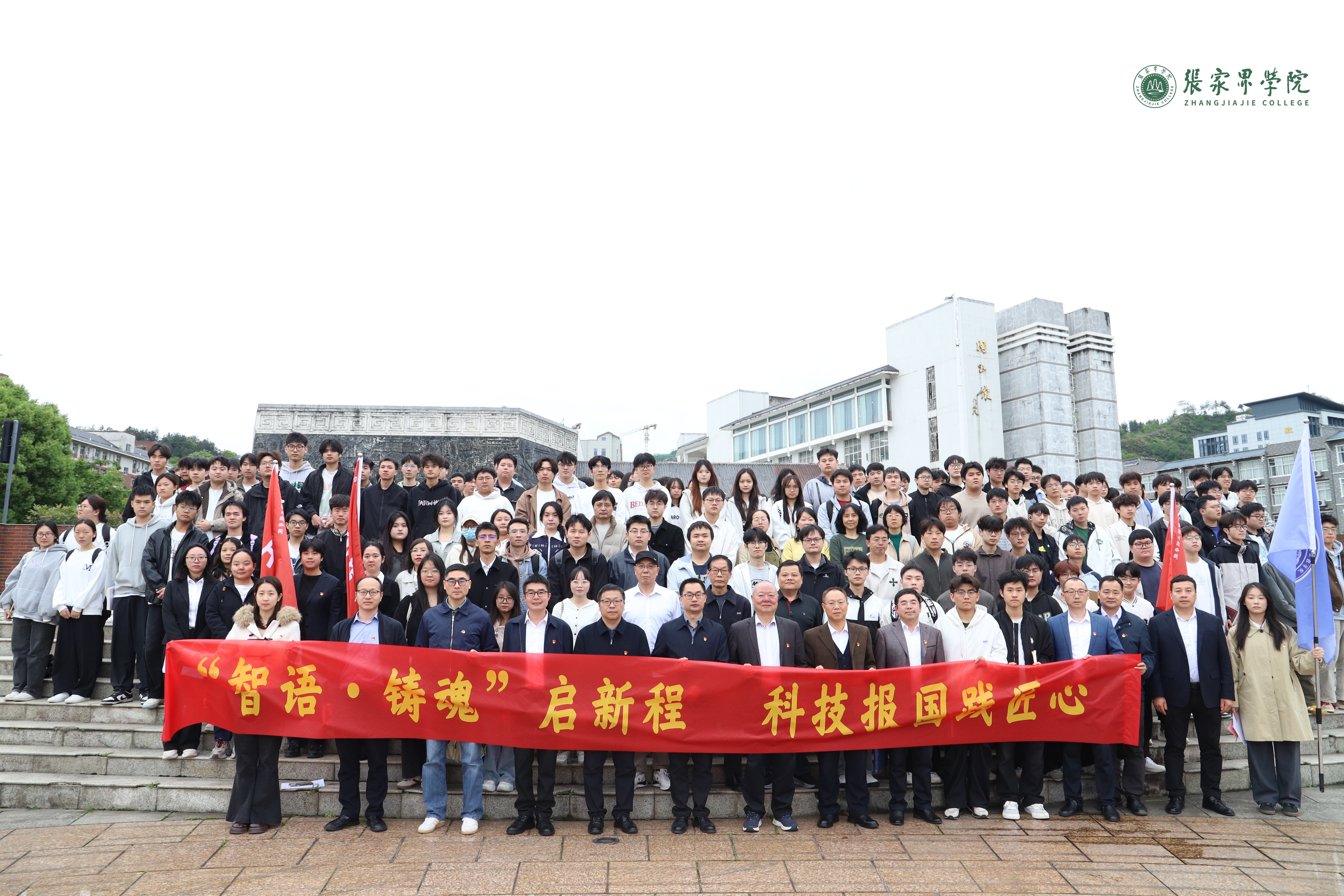 仪式现场,校领导为“语智·铸魂”党建品牌下属的“语智同行”先锋队、“智慧坚守”突击队、“AI善治”志愿服务队授旗。