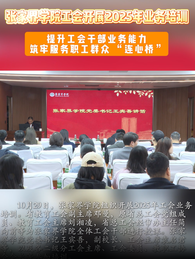 提升工会干部业务能力,筑牢服务职工群众 “连心桥”。10月29日,张家界学院组织开展2025年工会业务培训。省教育工会副主席邓曼,原省总工会党组成员、教育工会主席刘湘凌,省总工会经审办主任简向前等为张家界学院全体工会干部进行授课。张家界学院党委书记王宾吾,副校长、工会主席袁启君等,以及各二级分工会主席、工会委员、教职工协会会长等参加培训。