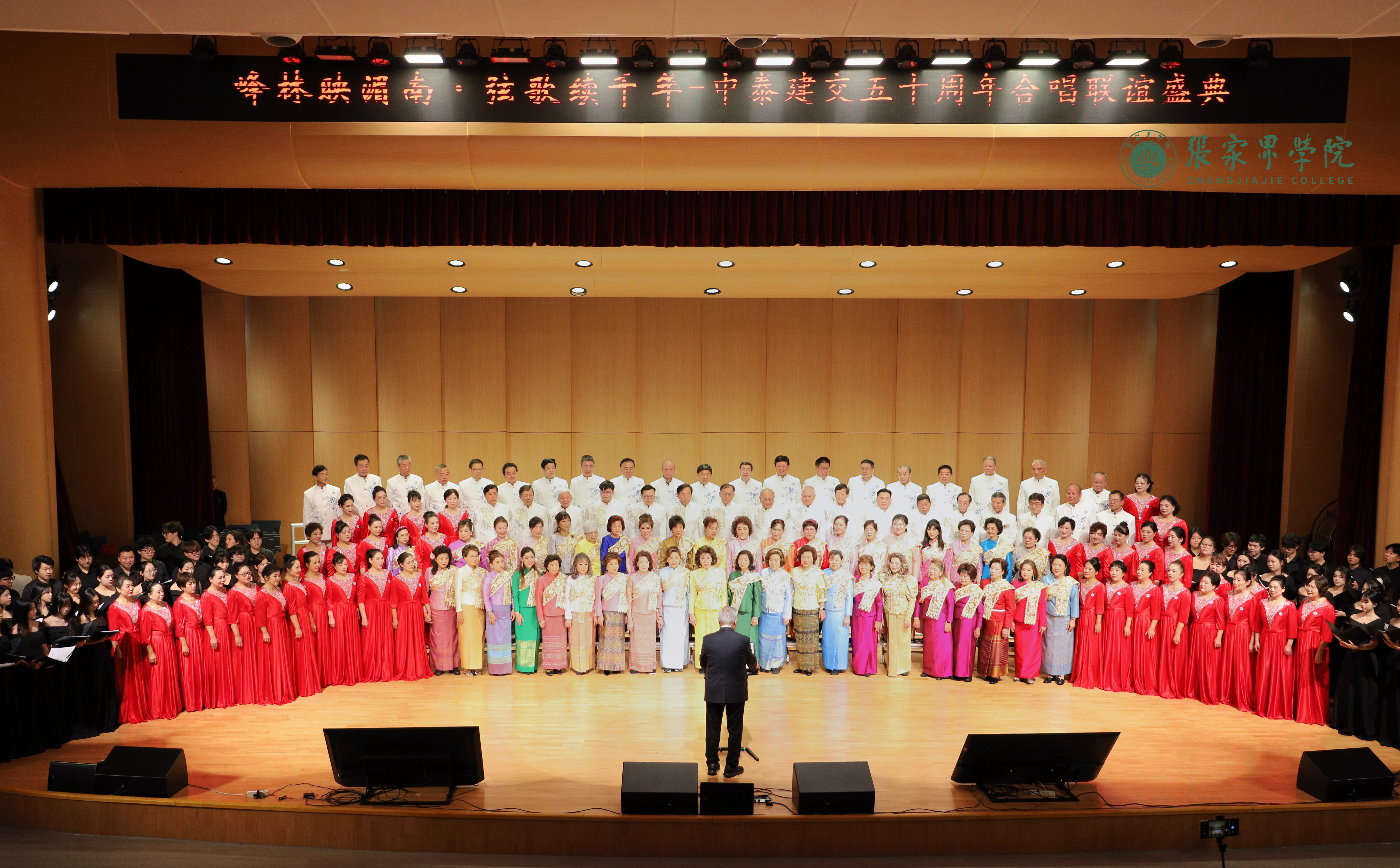 11月16日下午,“峰林映湄南·弦歌续千年——中泰建交五十周年合唱联谊盛典”在张家界学院音乐厅举行。中泰两国合唱团体以歌为媒,共叙建交五十周年的深厚情谊。泰华文化教育基金会副主席、泰国乐运合唱团团长何韵,国家一级演员、前中央乐团合唱团团长、泰国乐运合唱团艺术指导兼指挥肖铭炎,张家界学院校长简德彬,副校长范本祁,董事会秘书姚星明以及各二级单位主要负责人参加活动。